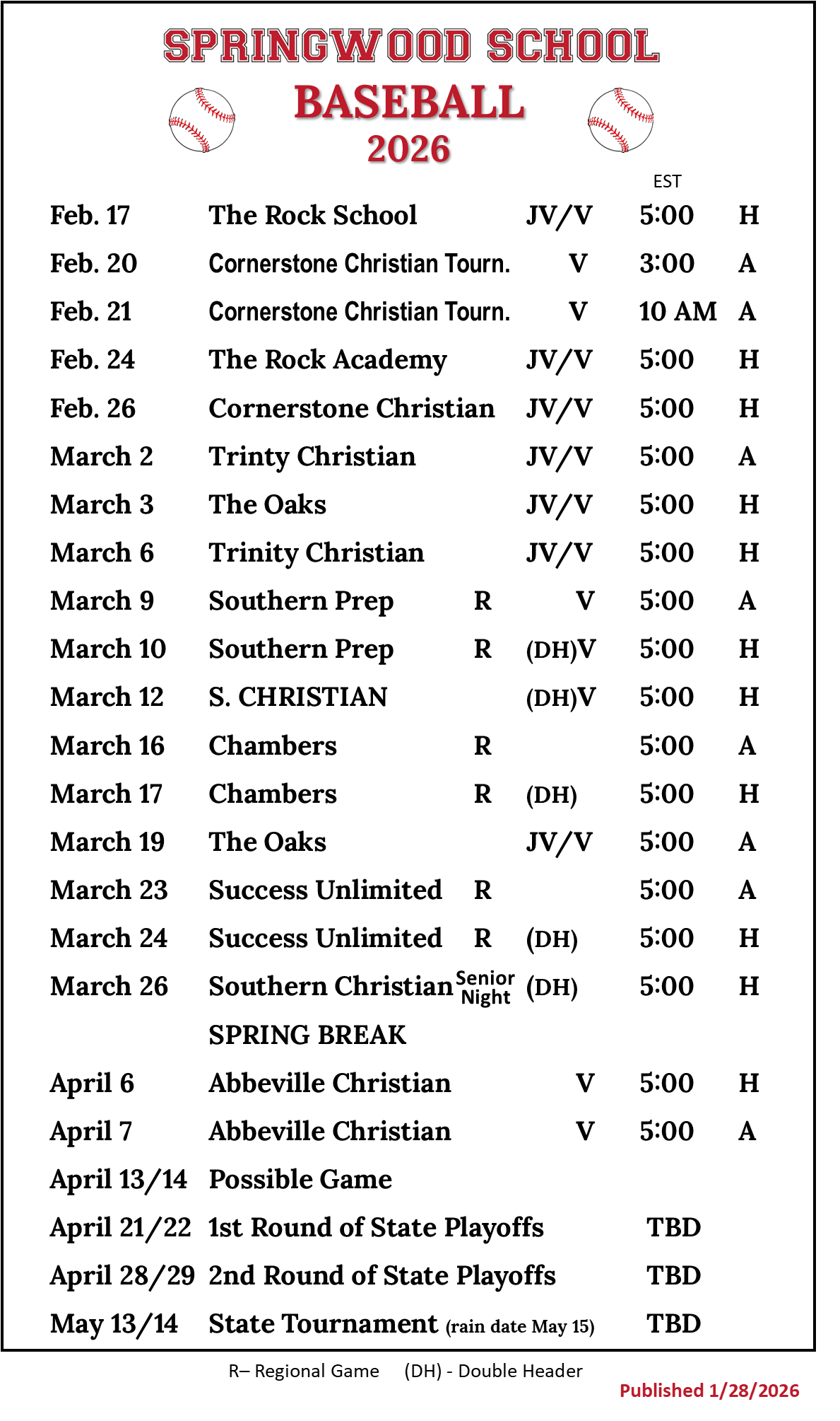 About Welcome Mission and Vision Memberships and Accreditations School Information and Services Employment Opportunities 2025 Impact Report The Springwood Fund Admissions Welcome Apply Today Request Information Tuition Assistance Alabama Scholarships Tuition Information International Welcome Springwood International House Residential Life Campus and Location Application Information Academics Welcome Primary School Elementary School Jr High School High School College, Career, & Academic Counseling Athletics Welcome Our Sports Basketball Cheerleading Baseball Golf Soccer Softball Track and Field Football Volleyball Cross Country Fishing Athletic Complex Forms Listen Live! Wildcat Athletic Association Campus Life Welcome Fine and Performing Arts Spiritual Life Organizations/Clubs Core Values Community Service Interim Days Calendar Alumni Directory Donate Now